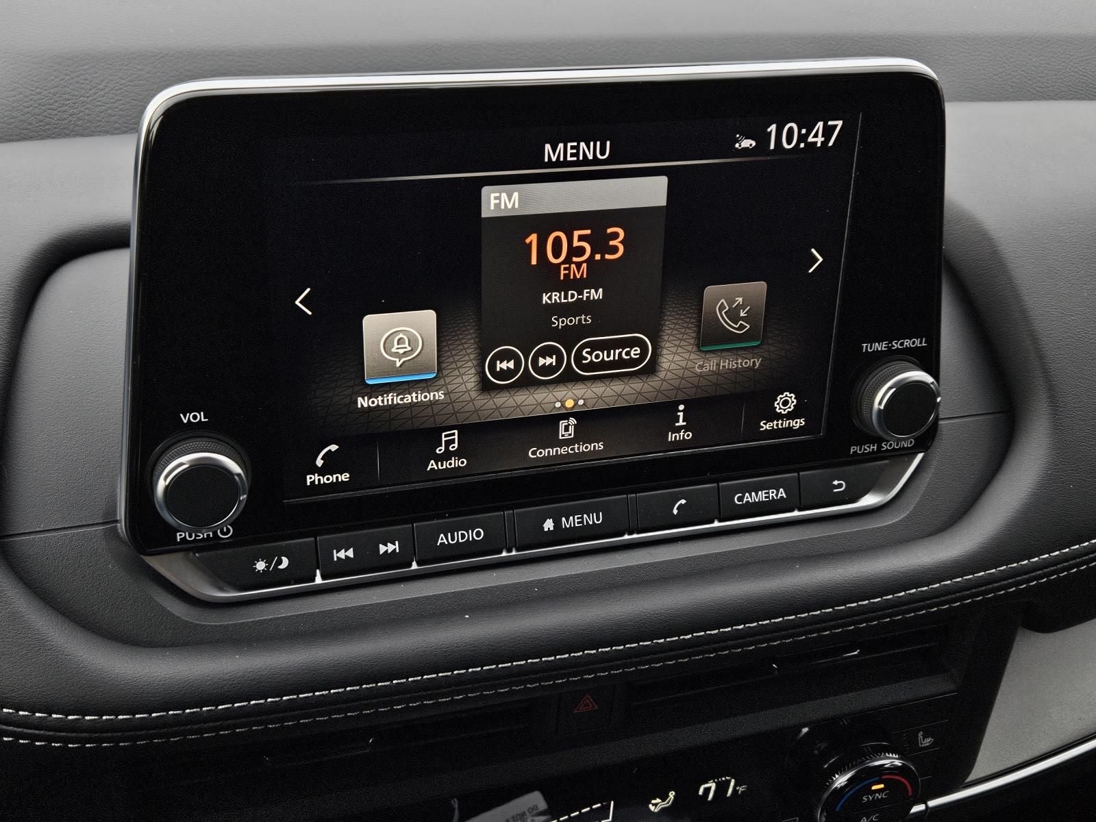 - Radio: AM/FM NissanConnect -inc: 6 speakers plus 2 tweeters, Apple CarPlay, Android Auto, 8" color touch screen display, Bluetooth®, 2 front USB type-C, Wi-Fi hotspot and NissanConnect Services powered by SiriusXM