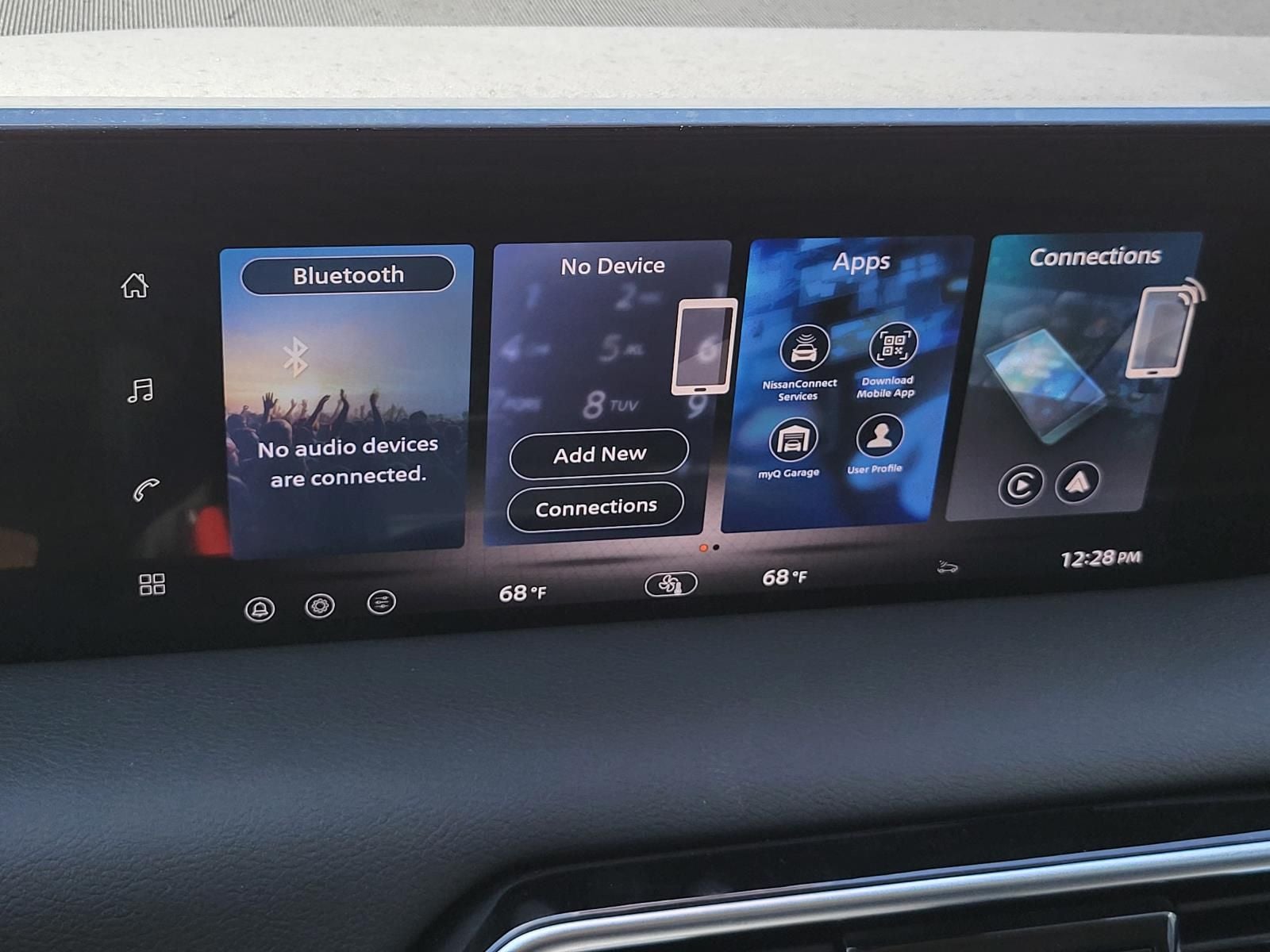 - Radio: NissanConnect w/SiriusXM 360L -inc: 6 speakers w/advanced audio features, 12.3" center touch-screen display, wireless Apple CarPlay and Android Auto, Bluetooth® hands-free phone system, Siri Eyes Free, hybrid radio, 5G capability, 2 USB type-C connection ports in front, Amazon Alexa w/Hotword, voice recognition and system controlled navigation w/traffic information